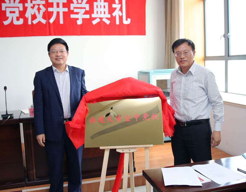 我校党校常务副校长邓宏宝与中国移动江苏公司南通分公司副总经理朱建军为空中党校揭牌。