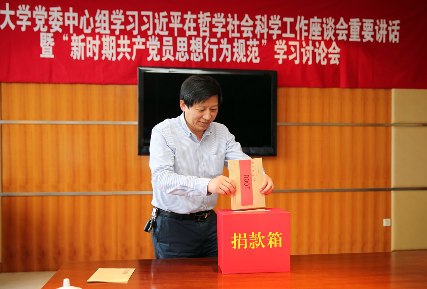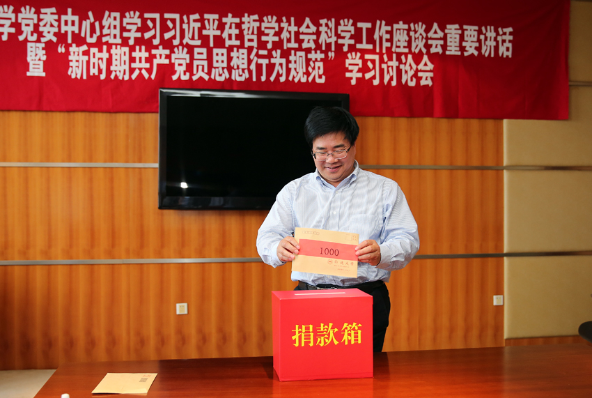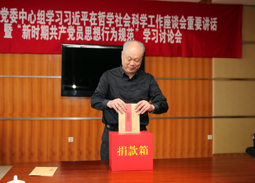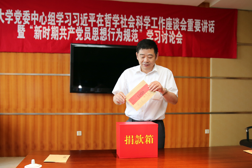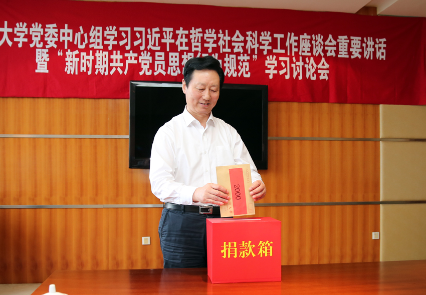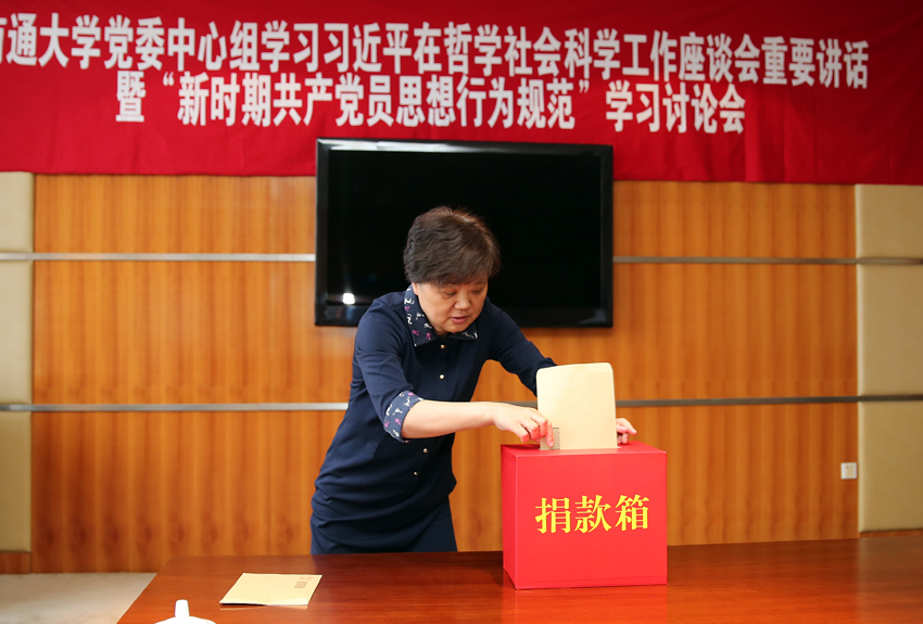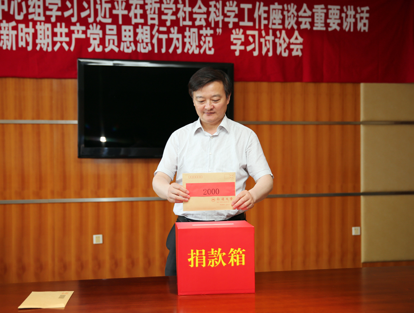 彭怀祖、蒋乃华分别围绕习近平总书记在哲学社会科学工作座谈会上的重要讲话精神、新时期共产党员思想行为规范作专题读讲。与会校领导先后发言,结合各自工作实际,畅谈学习体会。一致认为,习近平总书记在哲学社会科学工作座谈会上的重要讲话思想深邃、内涵丰富,从全局和战略高度、历史和现实的高度、面向世界和面向未来的高度,科学回答了事关哲学社会科学发展的一系列根本性、战略性的重大问题,是一篇加快构建中国特色哲学社会科学的纲领性文献,并从学科建设、人才队伍建设、教学改革等,对进一步推进我校哲学社会科学发展提出了建议。与会校领导还围绕“坚定信仰信念 保持党员本色”专题,开展“新时期共产党员思想行为规范”学习讨论。会上,校领导成长春、程纯、彭怀祖、董正超、丁斐、蒋乃华、樊小东、姜佩剑现场为“创建绿色校园 共享美丽通大”党员植树活动捐款,校领导江应中、高建林、顾菊平因公出差委托现场捐款,积极践行“两学一做”学习教育宗旨。