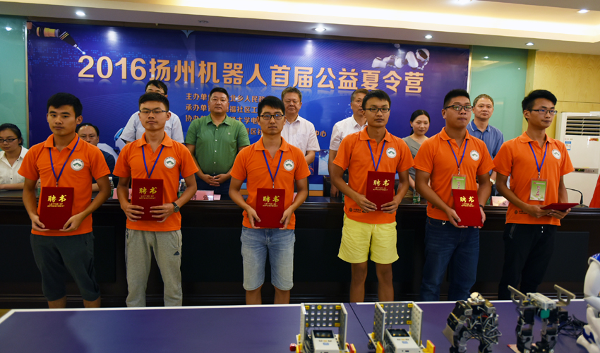 8月8日,2016扬州机器人首届公益夏令营活动开营仪式暨南通大学电气工程学院青少年机器人培训基地揭牌仪式在扬州市城北乡鸿福社区举行。电气工程学院院长堵俊、城北乡党委书记陈福新共同为“南通大学电气工程学院青少年机器人培训基地”揭牌。学院六名大学生志愿者受聘为本次夏令营的指导老师。