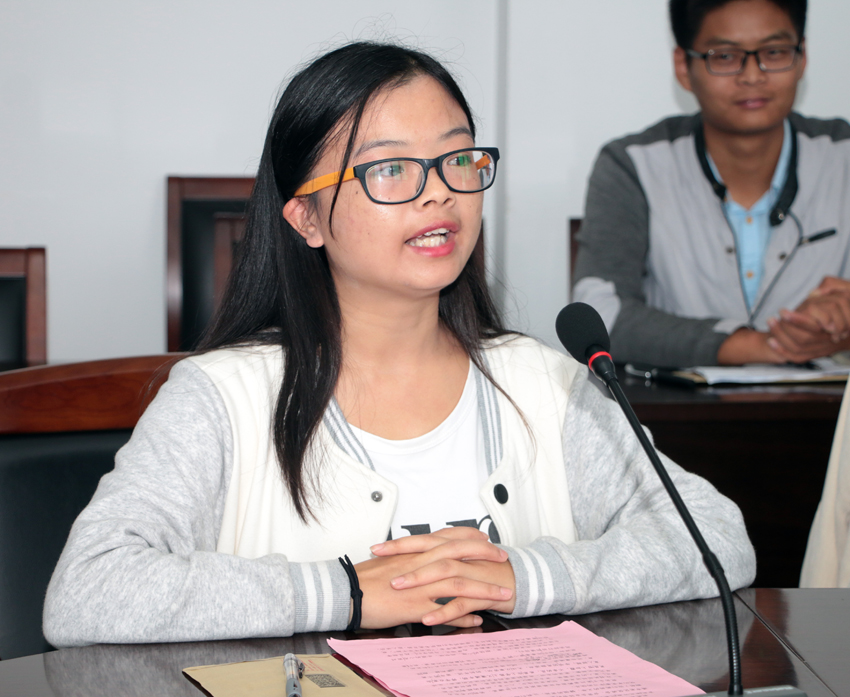 教科院莫跃恋作为受助学生代表发言,表达了对资助单位的感谢。她汇报了自己的学习情况,表示将继续努力学习,尽己所能来回报学校、社会所给予的温暖帮助。