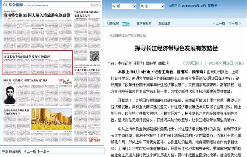 4月19日出版的《光明日报》在综合新闻版以《第四届长江经济带发展论坛探寻长江经济带绿色发展有效路径》为题,报道了第四届长江经济带发展论坛概况。