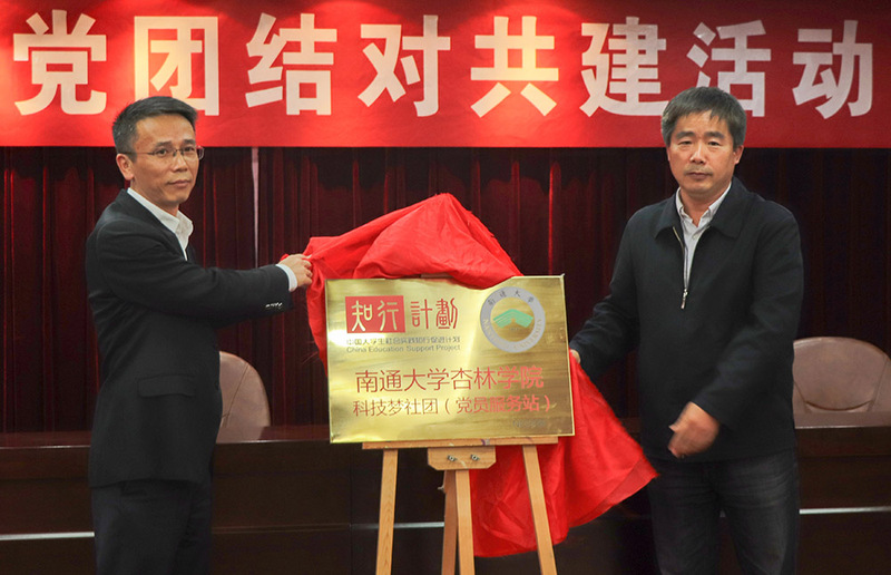 启东支行行长王新、杏林学院党委书记陆伟家为党员服务站揭牌。
