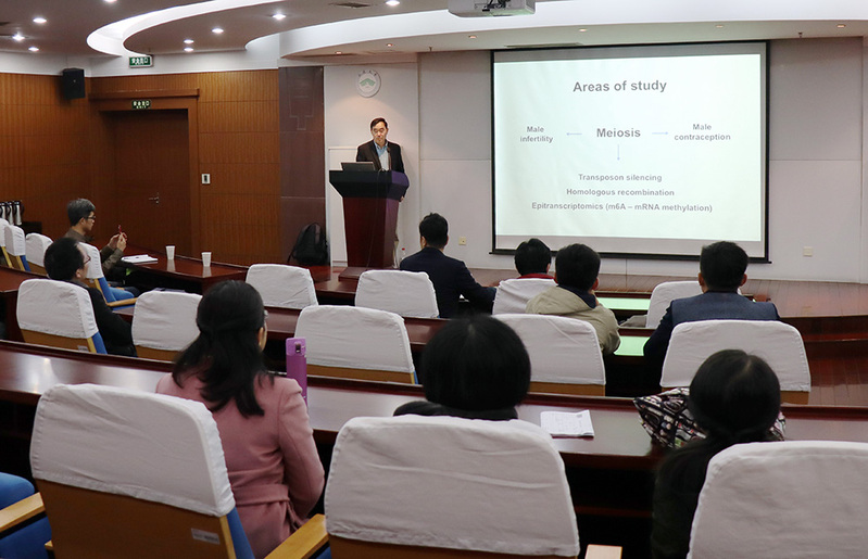 王培京教授详细介绍了全基因组范围转座子沉默的相关机制,其主要内容涉及转座子在雄性精子发生过程中的遗传学和表观遗传学调控,MOV10L1、MOV10、TEX和MORC基因如何调控精子发生的作用机理,包括piRNAs的生物合成、DNA甲基化、组蛋白修饰、染色质重构和反转座作用等。王培京教授围绕“control of retrotransposons in the germline”这一问题同现场师生进行了深入交流。报告会得到与会师生的一致好评,现场提问络绎不绝,学术交流氛围浓厚。