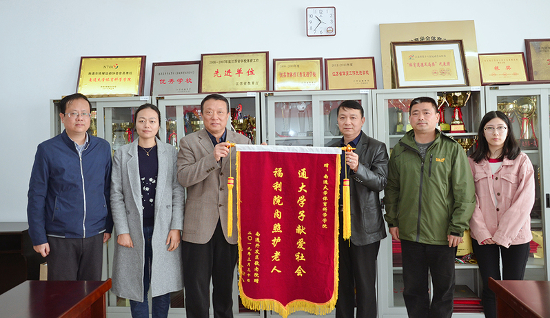 4月3日上午,南通开发区敬老院护理部主任顾惠忠将感谢信和一面写有“通大学子献爱社会,福利院内照护老人” 的锦旗送到体育科学学院,感谢研17体育姜玉桐同学积极主动为敬老院老人做义工。