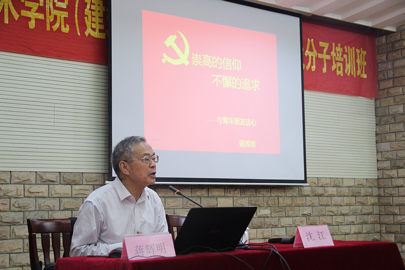 蒋辉明分享了自己53载对党的忠诚和追求,指出信仰是对真理的坚信不疑的认定,希望学员们把坚定的理想信念与脚踏实地的工作紧密结合起来,正确处理人民利益和个人利益的关系,发扬无私奉献和自我牺牲精神,自觉加强自身修养,勤奋学习,努力提高为人民服务的本领。陈燕为入党积极分子做了题为《改革开放与中国特色社会主义》的讲座,围绕改革开放的历史进程与重大意义,对改革开放40年来进行了时间线梳理,并结合改革浪潮中鲜活、经典的案例生动阐释了改革开放对国家和社会发展的重要性,希望同学们积极面对未来的机遇和挑战,紧跟时代潮流,认真学习,提升自我。徐双俊以《与廉洁同行》为主题,列举了大学生不廉洁现象的具体行为,讲解了廉洁的必要性以及腐败的危害,鼓励同学们从身边做起,与廉洁同行,不追求不合理的个人欲望,在追求合理欲望时不能使用不合理的手段。汪松明做了题为《党员的权利和义务,如何争取早日加入党组织》的讲座,详细解读了《中国共产党章程》中规定的八项权利和八项义务内容,指出八项义务和八项权利两者是相互联系、相辅相成的,没有无义务的权利,也没有无权利的义务,希望学员们进一步认真学习党章和党的理论知识,端正自己的入党动机,加强党性修养,要以党员标准严格要求自己,起到模范带头作用,争取早日跨入党组织的大门。