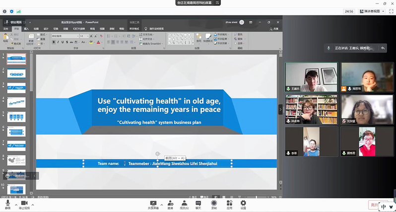 “我们所做的创意本子实际就是商业策划书,里面包含市场分析、商业模式、财务管理、风险分析、企业管理等多个部分。考虑到团队有学妹尚未学习风险分析、财务管理等相关课程内容,我和周思玮就主动承担这两部分的内容撰写及PPT制作,把市场分析如swot模型、竞态分析等内容交由两位学妹完成。”队长王嘉乐说,“天年”文本的撰写及翻译过程得以顺利推进,有赖于组员间的明确分工和高效合作。