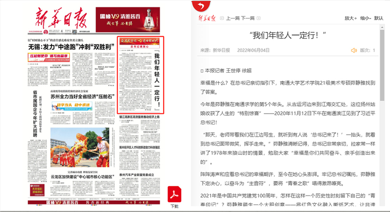 6月4日出版的《新华日报》以《“我们年轻人一定行!”》为题,报道了我校艺术学院学生茆静雅在2020年11月南通滨江见到习近平总书记后深受鼓舞,找到了“幸福是什么”的答案。