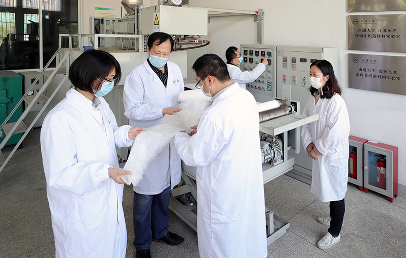 安全防护用特种纤维复合材料研发国家地方联合工程研究中心团队成员在研发疫情用防护材料。