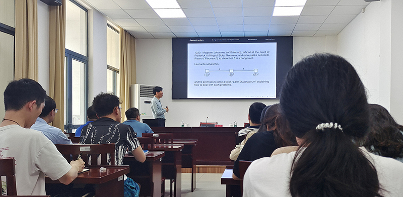 秦厚荣在报告中回顾了同余数问题悠久的发展历史、以田野教授为代表的国内外数学家们在同余数问题研究中取得的突出成就,并详细介绍了他的团队在这一问题上的研究成果,特别是同余数问题与代数K理论存在的紧密联系。报告内容丰富、深入浅出,给参会师生很大启发。