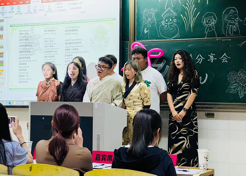 来自苗族、彝族等7个不同民族的18位同学围绕家乡的民俗民风进行一一展示。其中,来自西藏的曲尼拉姆和达珍用充满力量的藏地舞蹈将观众带到了幅员辽阔的青藏高原;来自“动植物王国”云南的蒲俊介绍了西南地区独特的饮食文化,用豌豆凉粉、喜洲粑粑、乳扇等带来了一场盛大的视觉与味觉盛宴;来自黑龙江的田野和马艳红介绍了他们心中的乌苏里江,以及赫哲族鱼皮画、鱼皮衣的发展历史与文化传承;来自南京的金穆青介绍了家乡回族同胞祈泓福、道平安的开斋佳节;来自新疆的苗宇轩通过轻快灵巧的新疆舞,将属于西北地区的热情与活力传递给了在场的每一位观众。作为苗族的一分子,吴周琼带来的《桃花溜溜红》《敬酒歌》等曲目活泼灵动,展现出强烈的民族自豪感;索朗旦增等九位同学的大合唱《卓穆仁青岗》气势磅礴,表达了对西藏美丽风光的赞美和对祖国的歌颂;赵鸿钧带领观众走进彝族人的世界,介绍了彝族热闹非凡的火把节、独具特色的服饰以及善良坚毅的彝族人民;朱昱睿表演的扬州杖头木偶戏,细腻传神,刚柔相继,带领观众们领略了非遗文化不一样的精彩。