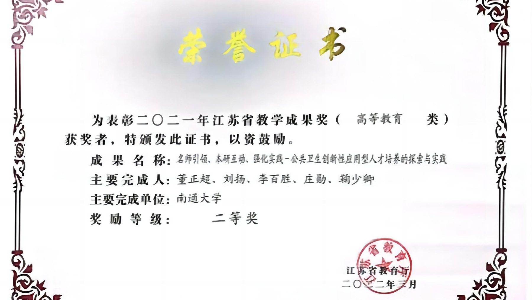 深化教育教学改革,提升人才培养质量。学院主动探索以岗位胜任力为导向的“新医科”创新创业人才培养模式,优化人才培养方案,积极推进教材建设,探索多学科交叉的课程改革,创新实践课程的教学方法,开展青年教师讲课竞赛和周周有教研活动,形成了一批教学典型案例和教改教研项目。学院获教育部产学研合作项目3项、省高等教育教学改革研究课题1项、省大型科学仪器开放共享自主研究课题1项、省专业建设典型案例2项、省级青年教师讲课比赛二等奖1项。主编全国医学普通高等教育“十四五”规划示范教材、“十三五”江苏省高等学校重点教材各1部,《预防医学》教材获省重点教材建设立项。《名师引领、本研互动、强化实践-公共卫生创新性应用人才培养的探索与实践》获江苏省教学成果奖二等奖1项。