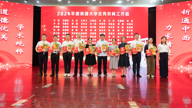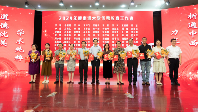 杨宇民宣读了第五届江苏省高校青年教师教学竞赛我校获奖名单,关于表彰南通大学2024年教学名师、优秀教育工作者的决定,以及从事教育工作满30年教职工名单。与会领导分别为获表彰者颁奖。杨宇民希望全校教职员工以获奖者为榜样,崇德修身、潜心育人、勤奋敬业、严谨治学,在各自岗位上尽职尽责、创造佳绩。