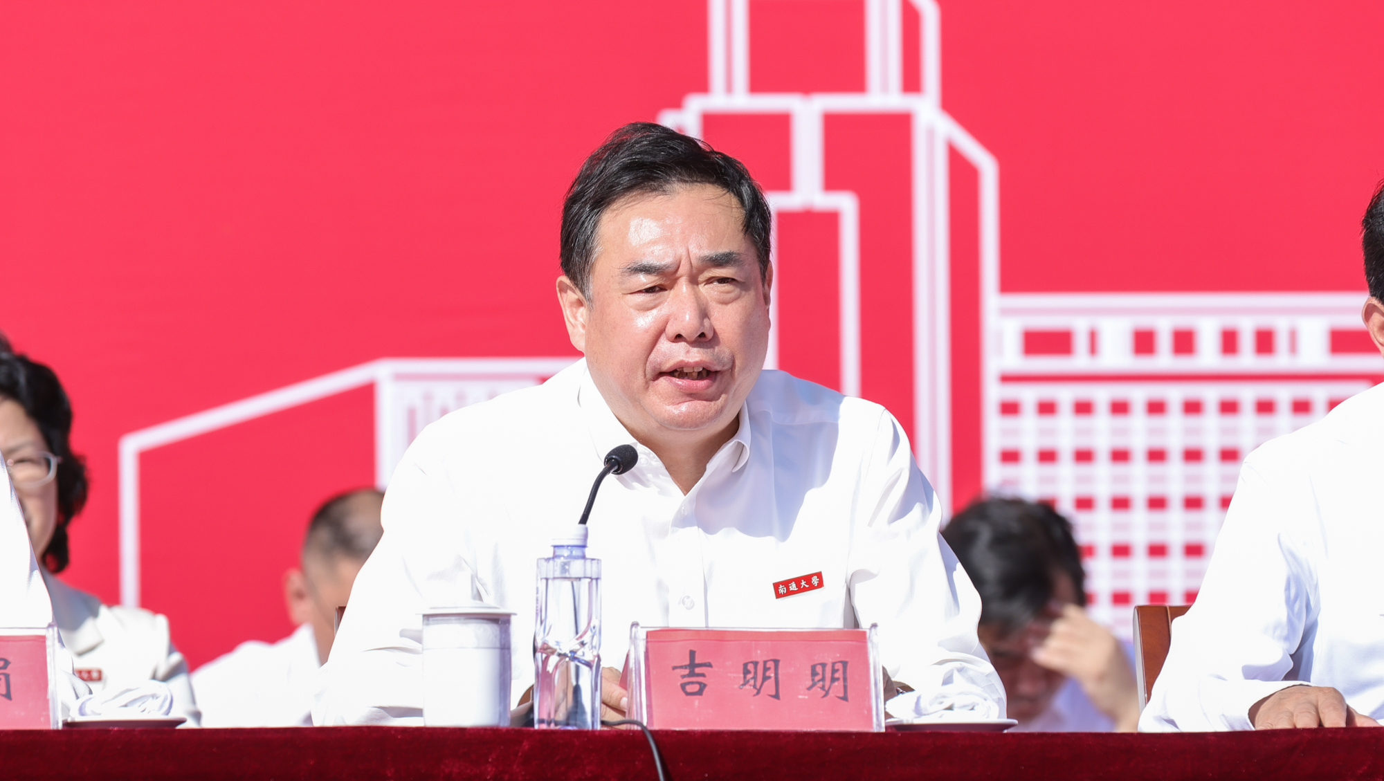 吉明明在主持时表示,一枚小小的校徽,不仅是“通大人”的身份标志,更承载着“祈通中西,力求精进”的校训精神。他希望每一位同学都能肩负起新时代通大人的使命与担当,勇敢地开启大学生活的新征程,牢记师长的寄语与教诲,心怀与国家同向同行的远大理想,探索充满新知的前沿领域,保持昂扬向上的信心和斗志,跑好中国式现代化的接力棒,在民族复兴的宏伟征程上谱写青春的华彩篇章。