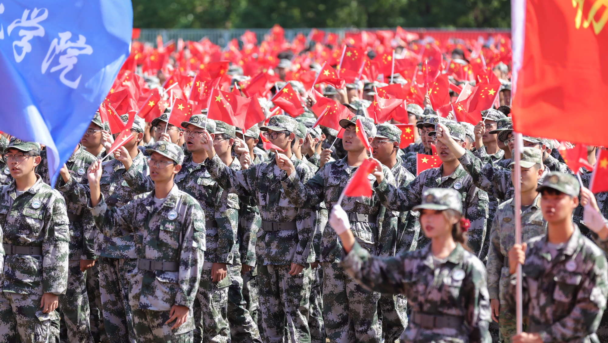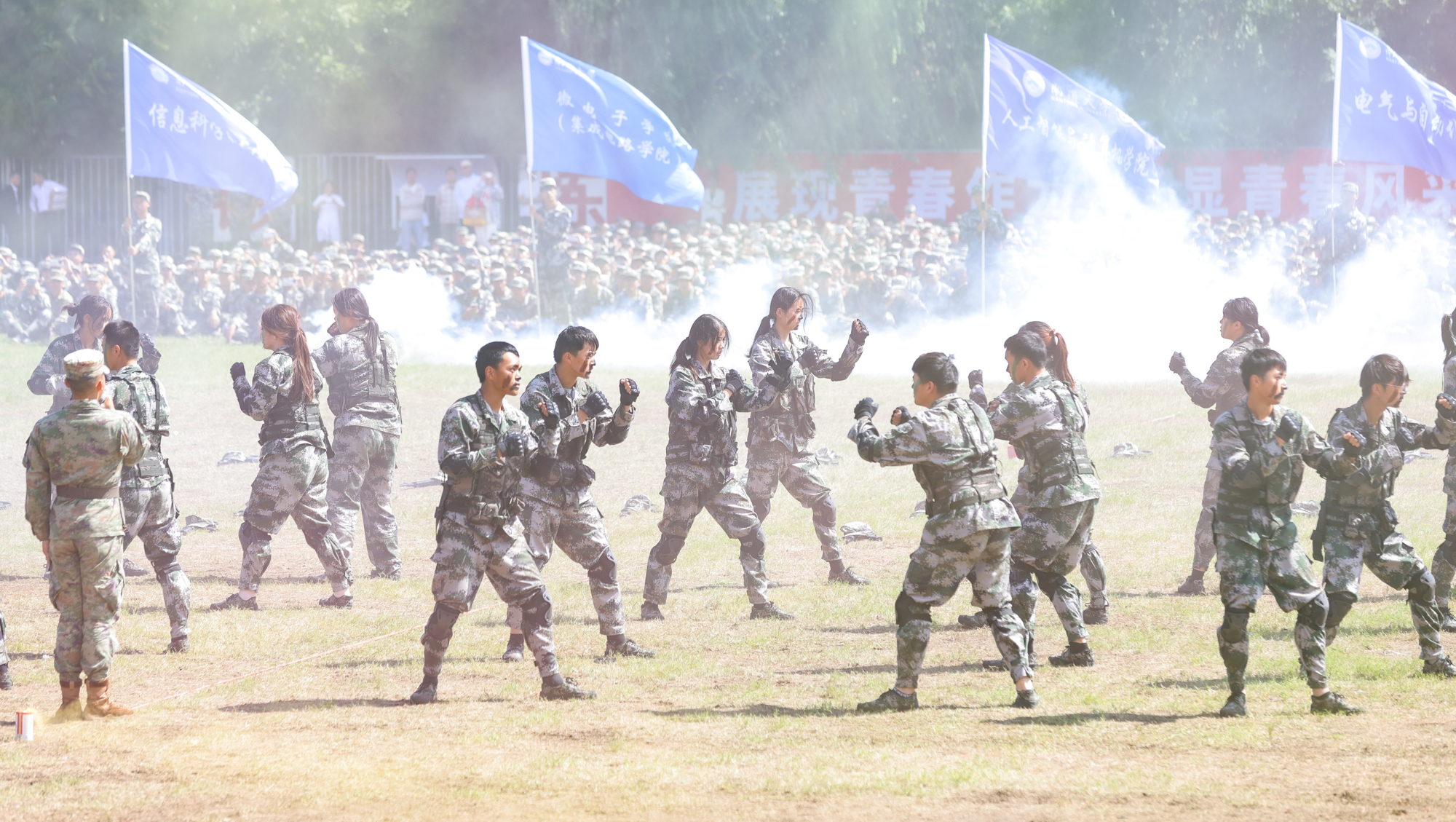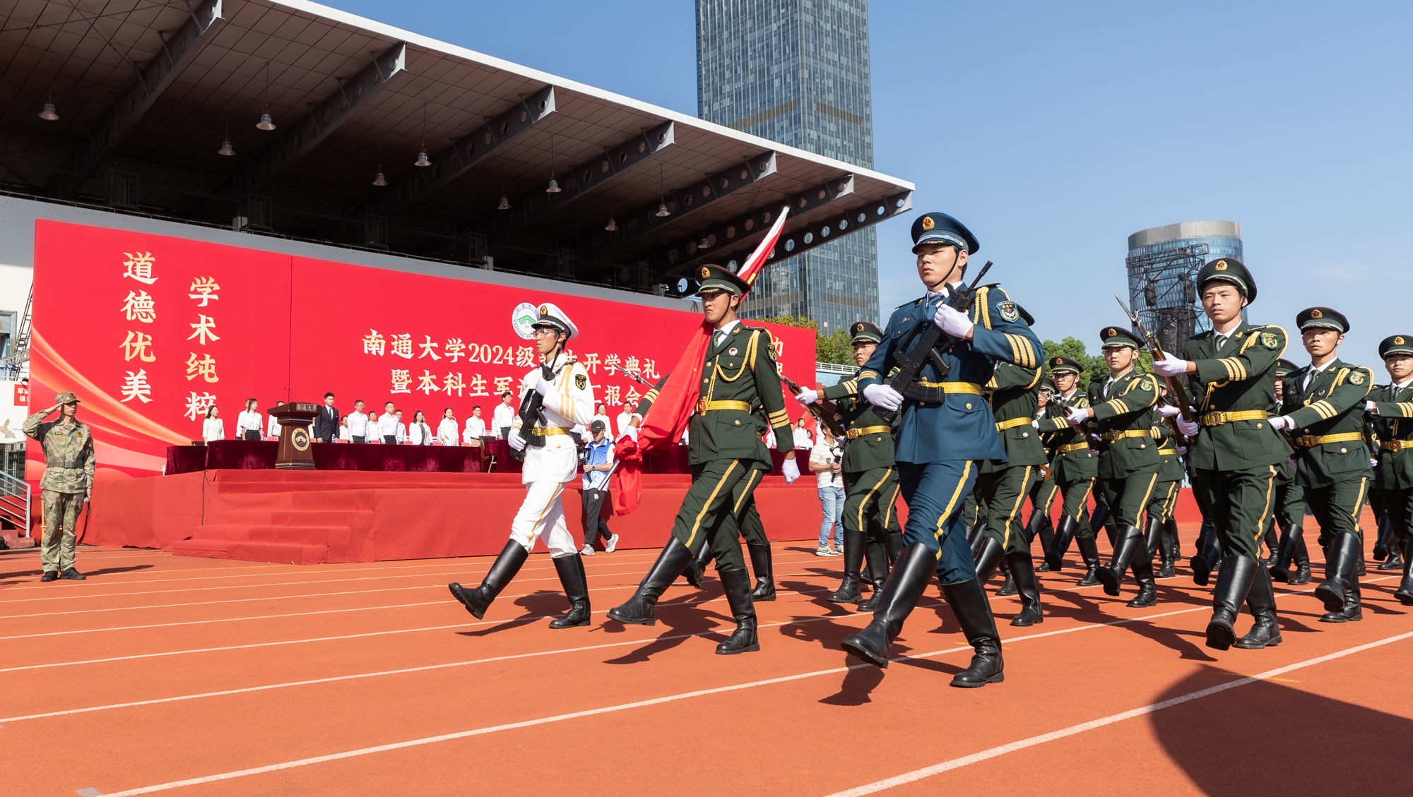 伴随着激昂的进行曲,各军训方阵步伐整齐、口号嘹亮,同学们士气高昂、军姿严整。花样方阵列队表演创意新颖,先后“绘制”出党徽、国旗、校徽等图案,以及“南通大学”“祈通中西”“力求精进”等字样,表达爱党爱国爱校的情怀。战术演练方队展示了立姿、坐姿和仰姿持枪,以及一路队形、前三角队形、后三角队形等,出拳虎虎生威,踢腿凌厉有力,展现了全体新生的勃勃生机。