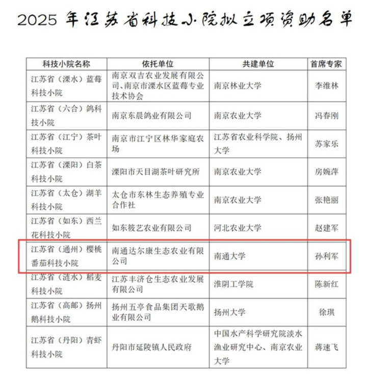 近日,江苏省科协发布《关于公布 2025 年江苏省科技小院名单的通知》,全省40 个江苏省科技小院得到认定、10 个江苏省科技小院得到立项资助。我校生命科学学院与江苏沿江地区农业科学研究所、南通达尔康生态农业有限公司联合共建的“江苏省(通州)樱桃番茄科技小院”成功入选并获得立项资助,生科院孙利军教授为该科技小院首席专家。