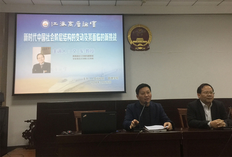 11月26日晚,华东师范大学社会发展学院院长文军教授作客第16期“江海高层论坛”,为管理学院师生作了题为《新时代中国社会阶层结构的变动及其面临的新挑战》的学术报告。文军从分析中国社会正处在一个深度结构性转型过程入手,介绍了中西社会分层的各种理论和方法,并进一步剖析了中国社会分层的结构性特征和社会后果,提出了社会分层后果的应对策略。会前,文军与管理学院部分骨干教师进行了座谈,着重针对学院科学研究、项目申报、学科发展等进行指导,并对部分教师的国家社科基金项目申报材料提出修改意见。报告会由管理学院院长蒋国宏主持,80多名师生代表聆听了报告。(黄功勤唐新林)文军教授作客第16期“江海高层论坛”