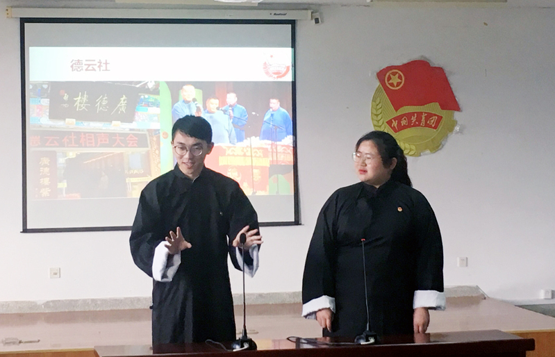 4月25日下午,外国语学院商务英语161、171团支部举办“青春筑梦新时代,自信领航新征程”主题团日活动。活动以外国语学院“百灵鸽”学生志愿者带领非洲来华留学生参观北京为主线,围绕“传承古文化、歌颂新中国、展现新面貌、步入新时代以及展望科技梦”五方面,通过相声、合唱、情景剧、诗朗诵、杯子舞等节目形式,讲述了外国友人眼中新时代中国在经济发展、文化强国、科技兴国等领域取得的辉煌成就。本次主题团日活动旨在号召全院团员青年认真学习十九大精神,坚定理想信念,以青春的活力、朝气,砥砺奋进迎接新时代,青春筑梦踏上新征程,在实现中华民族伟大复兴的历史舞台上贡献青春力量,展现青春风采。(禹露/文尚印倩吴琼/摄)外国语学院举办“青春筑梦新时代,自信领航新征程”主题团日活动。