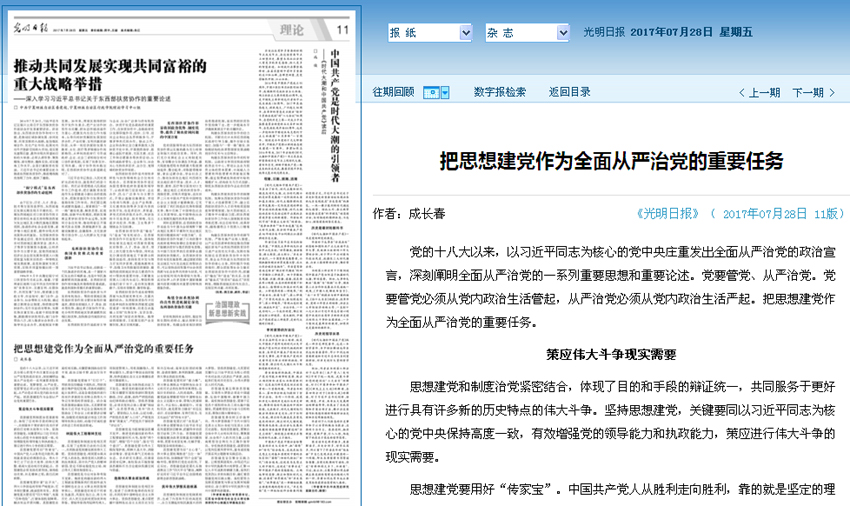 7月28日出版的《光明日报》理论版,刊登我校党委书记、中特基地主任成长春教授署名文章《把思想建党作为