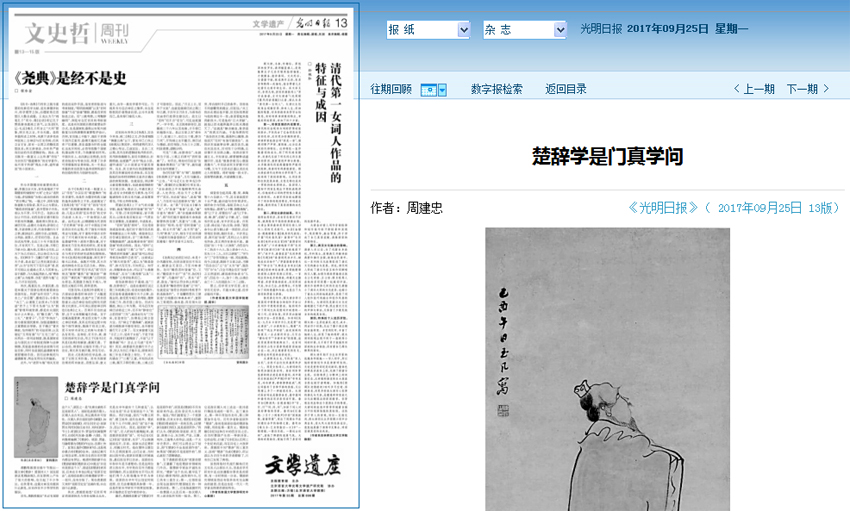 9月25日,光明日报在文学遗产版《文史哲周刊》刊登我校楚辞研究中心周建忠教授题为《楚辞学是门真学问》