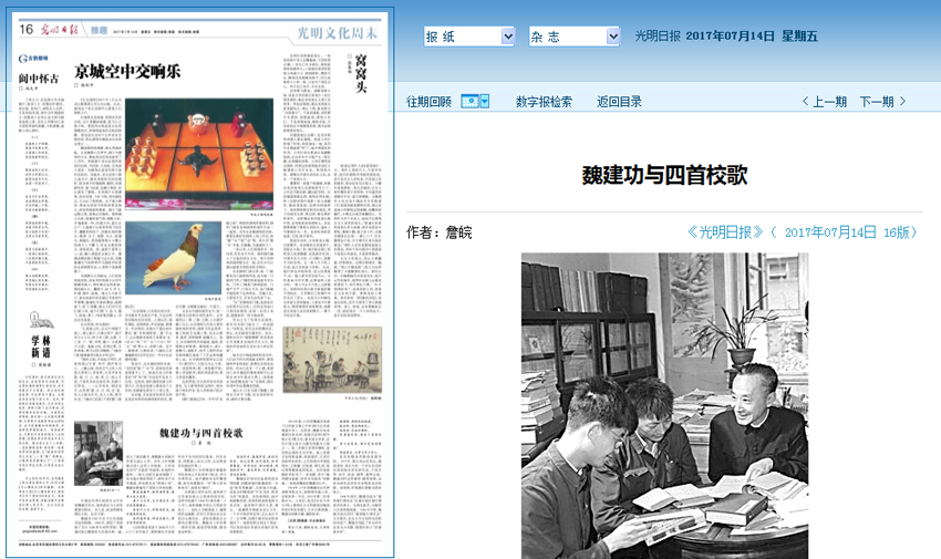 7月14日出版的《光明日报》“光明文化周末”版,刊登我校艺术学院詹皖教授对近代校歌的研究文章《魏建功