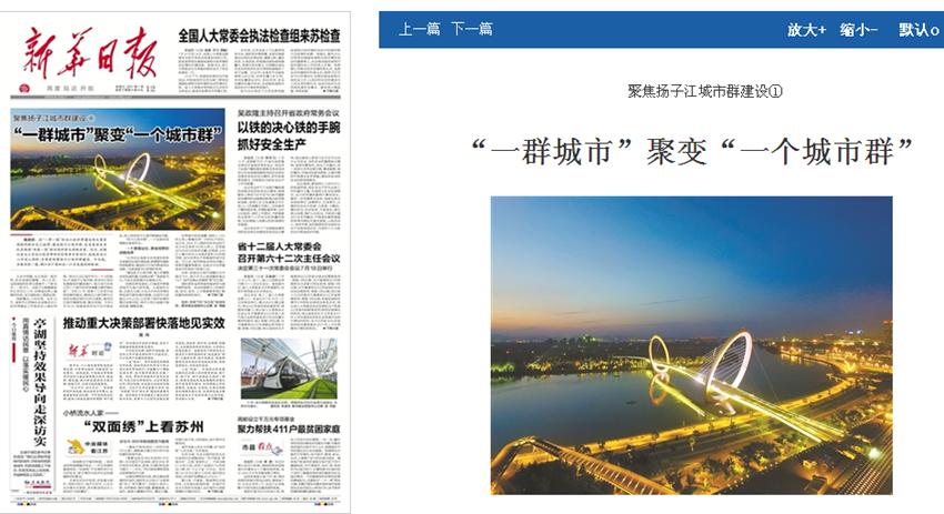 7月12日出版的《新华日报》头版头条,刊登“聚焦扬子江城市群建设系列报道之一”《“一群城市”聚变“一