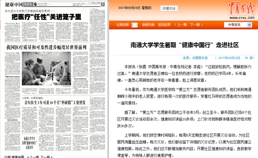 8月24日出版的中国青年报在第六版刊发题为《南通大学学生暑期“健康中国行”走进社区》的报道,关注我校