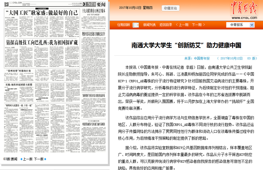 10月12日出版的中国青年报在要闻版刊登题为《南通大学大学生“创新防艾”助力健康中国》的报道,介绍我