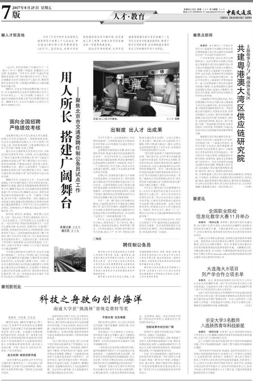 8月25日出版的中国交通报在人才教育版《创新创业》栏目,刊登题为《科技之舟驶向创新海洋 南通大学获“