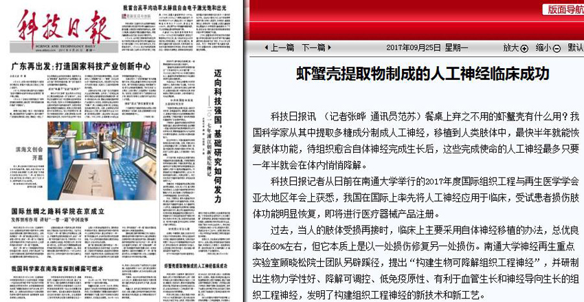9月25日出版的科技日报头版刊发题为《虾蟹壳提取物制成的人工神经临床成功》的报道,介绍了我校神经再生