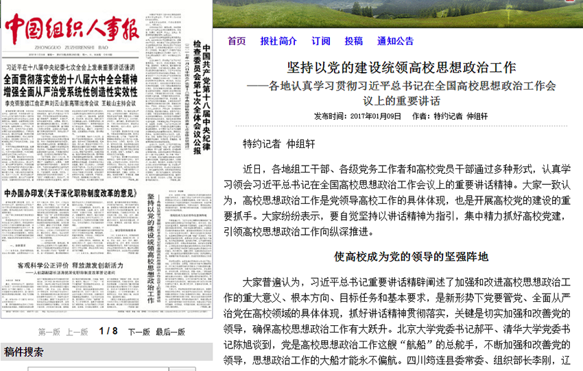 1月9日出版的中国组织人事报头版刊发题为《坚持以党的建设统领高校思想政治工作——各地认真学习贯彻习近