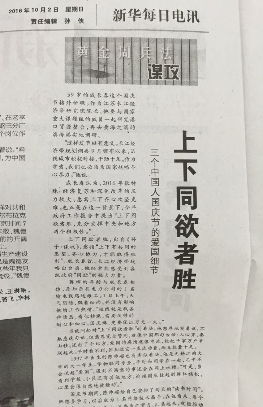 10月1日,新华网刊登由新华社记者张展鹏撰写的文章《上下同欲者胜——三个中国人国庆节的爱国细节》,记
