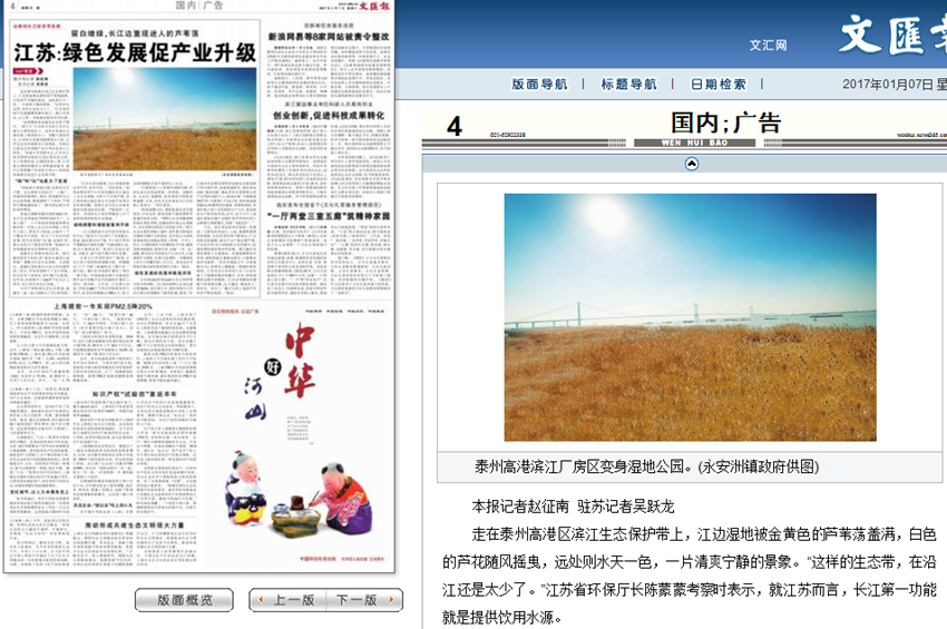 1月7日出版的《文汇报》在4版头条位置刊发题为《江苏:绿色发展促产业升级》的通讯报道,文中就江苏未来
