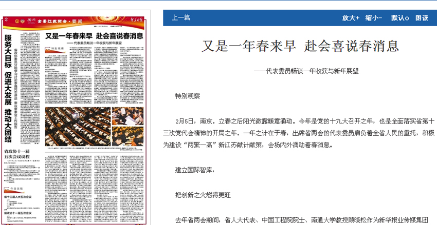 一年一度的江苏省“两会”近日在南京隆重开幕。2月6日出版的《新华日报》2版“特别观察”栏目,刊登两会