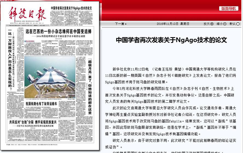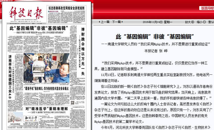 11月14日出版的《科技日报》头版头条以《此“基因编辑”非彼“基因编辑”》为题,对我校神经再生重点实