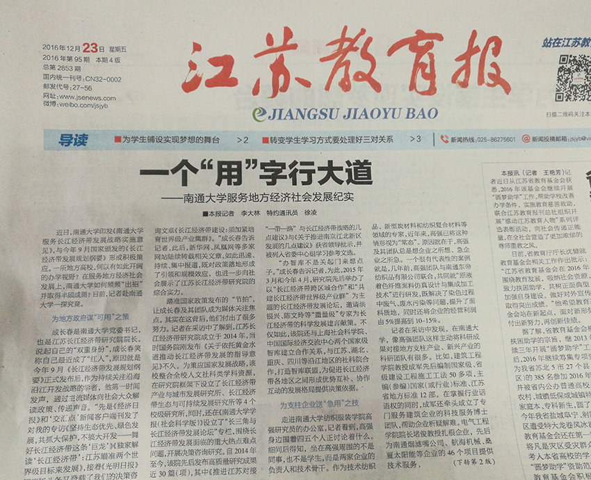 12月23日出版的江苏教育报,在头版头条刊登题为《一个“用”字行大道——南通大学服务地方经济社会发展